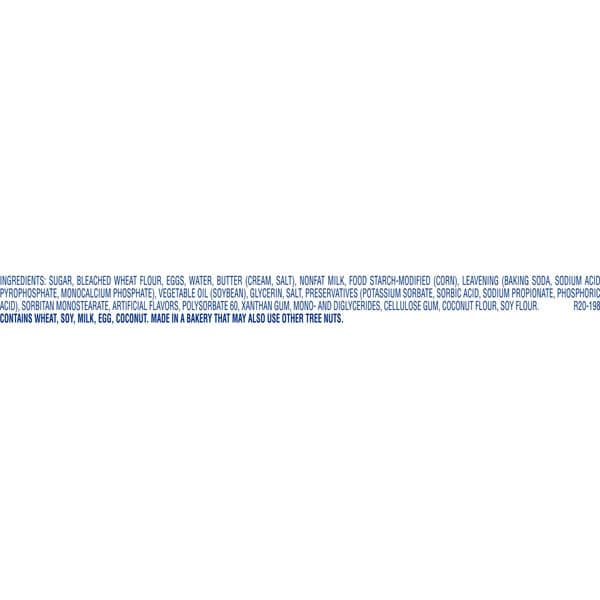 Sugar, Bleached Wheat Flour, Eggs, Water, Butter (cream, Salt), Nonfat Milk, Food Starch-modified (corn), Leavening (baking Soda, Sodium Acid Pyrophosphate, Monocalcium Phosphate), Vegetable Oil (soybean), Glycerin, Salt, Preservatives (potassium Sorbate, Sorbic Acid, Sodium Propionate, Phosphoric Acid), Sorbitan Monostearate, Artificial Flavors, Polysorbate 60, Xanthan Gum, Mono- And Diglycerides, Cellulose Gum, Coconut Flour, Soy Flour