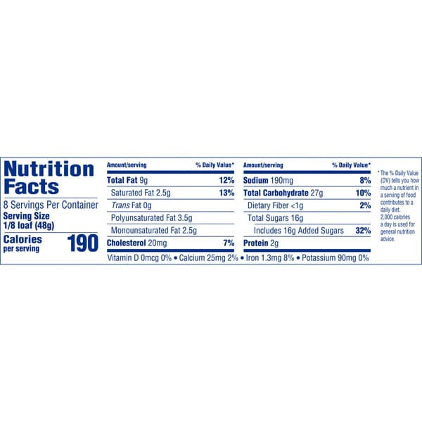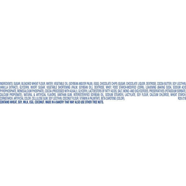 Sugar, Bleached Wheat Flour, Water, Vegetable Oil (soybean And/or Palm), Eggs, Chocolate Chips (sugar, Chocolate Liquor, Dextrose, Cocoa Butter, Soy Lecithin, Vanilla Extract), Glycerin, Invert Sugar, Vegetable Shortening (palm, Soybean Oil), Dextrose, Whey, Food Starch-modified (corn), Leavening (baking Soda, Sodium Acid Pyrophosphate, Monocalcium Phosphate), Cocoa (processed With Alkali), Glyceryl Lactoesters Of Fatty Acids, Salt, Mono- And Diglycerides, Preservatives (potassium Sorbate, Calcium Propionate), Natural & Artificial Flavors, Xanthan Gum, Interesterified Soybean Oil, Sodium Stearoyl Lactylate, Soy Flour, Calcium Chloride, Wheat Starch, Cornstarch, Artificial Color, Cellulose Gum, Soy Lecithin, Coconut Flour, Vitamin A Palmitate, Beta Carotene (color)