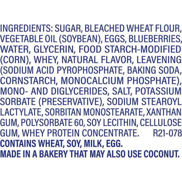 Sugar, Bleached Wheat Flour, Vegetable Oil (soybean), Eggs, Blueberries, Water, Glycerin, Food Starch-modified (corn), Whey, Natural Flavor, Leavening (sodium Acid Pyrophosphate, Baking Soda, Cornstarch, Monocalcium Phosphate), Mono- And Diglycerides, Salt, Potassium Sorbate (preservative), Sodium Stearoyl Lactylate, Sorbitan Monostearate, Xanthan Gum, Polysorbate 60, Soy Lecithin, Cellulose Gum, Whey Protein Concentrate