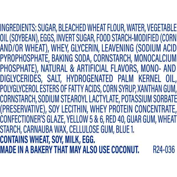 Sugar, Bleached Wheat Flour, Water, Vegetable Oil (soybean), Eggs, Invert Sugar, Food Starch-modified (corn And/or Wheat), Whey, Glycerin, Leavening (sodium Acid Pyrophosphate, Baking Soda, Cornstarch, Monocalcium Phosphate), Natural & Artificial Flavors, Mono- And Diglycerides, Salt, Hydrogenated Palm Kernel Oil, Polyglycerol Esters Of Fatty Acids, Corn Syrup, Xanthan Gum, Cornstarch, Sodium Stearoyl Lactylate, Potassium Sorbate (preservative), Soy Lecithin, Whey Protein Concentrate, Confectioner’s Glaze, Yellow 5 & 6, Red 40, Guar Gum, Wheat Starch, Carnauba Wax, Cellulose Gum, Blue 1