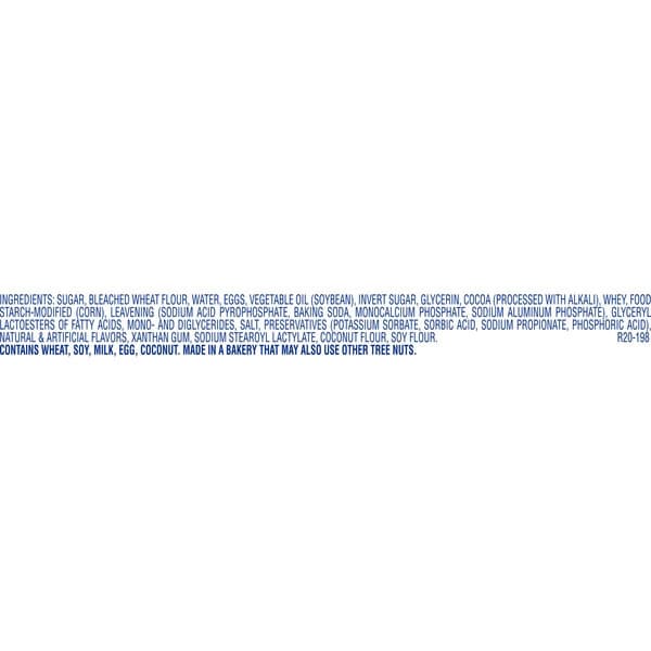 Sugar, Bleached Wheat Flour, Water, Eggs, Vegetable Oil (soybean), Invert Sugar, Glycerin, Cocoa (processed With Alkali), Whey, Food Starch-modified (corn), Leavening (sodium Acid Pyrophosphate, Baking Soda, Monocalcium Phosphate, Sodium Aluminum Phosphate), Glyceryl Lactoesters Of Fatty Acids, Mono- And Diglycerides, Salt, Preservatives (potassium Sorbate, Sorbic Acid, Sodium Propionate, Phosphoric Acid), Natural & Artificial Flavors, Xanthan Gum, Sodium Stearoyl Lactylate, Coconut Flour, Soy Flour