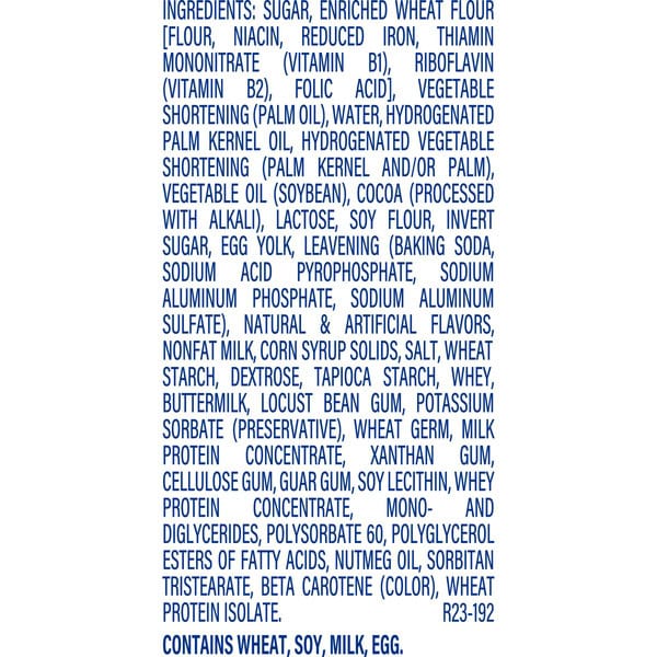 Sugar, Enriched Wheat Flour [flour, Niacin, Reduced Iron, Thiamin Mononitrate (vitamin B1), Riboflavin (vitamin B2), Folic Acid], Vegetable Shortening (palm Oil), Water, Hydrogenated Palm Kernel Oil, Hydrogenated Vegetable Shortening (palm Kernel And/or Palm), Vegetable Oil (soybean), Cocoa (processed With Alkali), Lactose, Soy Flour, Invert Sugar, Egg Yolk, Leavening (baking Soda, Sodium Acid Pyrophosphate, Sodium Aluminum Phosphate, Sodium Aluminum Sulfate), Natural & Artificial Flavors, Nonfat Milk, Corn Syrup Solids, Salt, Wheat Starch, Dextrose, Tapioca Starch, Whey, Buttermilk, Locust Bean Gum, Potassium Sorbate (preservative), Wheat Germ, Milk Protein Concentrate, Xanthan Gum, Cellulose Gum, Guar Gum, Soy Lecithin, Whey Protein Concentrate, Mono- And Diglycerides, Polysorbate 60, Polyglycerol Esters Of Fatty Acids, Nutmeg Oil, Sorbitan Tristearate, Beta Carotene (color), Wheat Protein Isolate