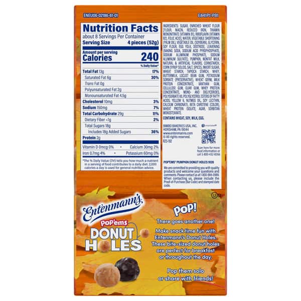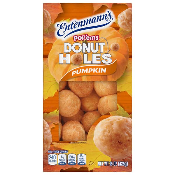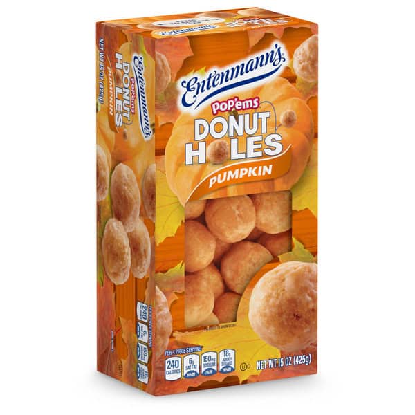Entenmann’s Pop’ems Pumpkin Donut Holes are moist, delicious, poppable snacks made with real pumpkin and have the just the right touch of sweet pumpkin-spice flavor. They make a great snack or dessert. Pop these delectable donut holes into your mouth on your next hayride or any occasion!