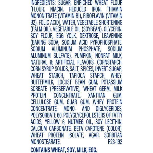 Sugar, Enriched Wheat Flour [flour, Niacin, Reduced Iron, Thiamin Mononitrate (vitamin B1), Riboflavin (vitamin B2), Folic Acid], Water, Vegetable Shortening (palm Oil), Vegetable Oil (soybean), Glycerin, Soy Flour, Egg Yolk, Dextrose, Leavening (baking Soda, Sodium Acid Pyrophosphate, Sodium Aluminum Phosphate, Sodium Aluminum Sulfate), Pumpkin, Nonfat Milk, Natural & Artificial Flavors, Cornstarch, Corn Syrup Solids, Salt, Spices, Invert Sugar, Wheat Starch, Tapioca Starch, Whey, Buttermilk, Locust Bean Gum, Potassium Sorbate (preservative), Wheat Germ, Milk Protein Concentrate, Xanthan Gum, Cellulose Gum, Guar Gum, Whey Protein Concentrate, Mono- And Diglycerides, Polysorbate 60, Polyglycerol Esters Of Fatty Acids, Yellow 6, Nutmeg Oil, Soy Lecithin, Calcium Carbonate, Beta Carotene (color), Wheat Protein Isolate, Agar, Sorbitan Monostearate