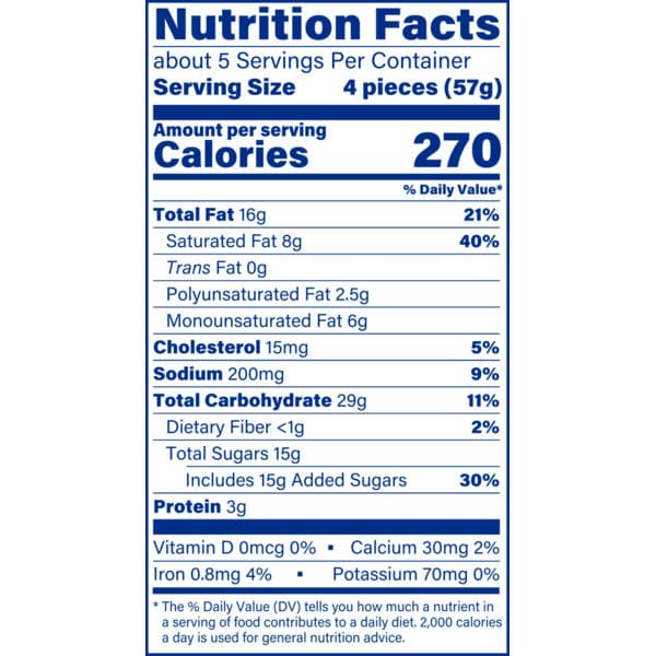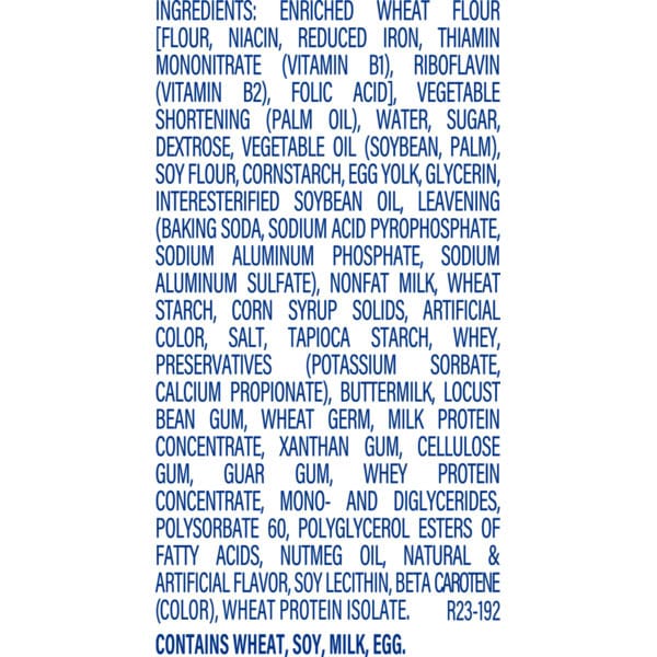 Enriched Wheat Flour [flour, Niacin, Reduced Iron, Thiamin Mononitrate (vitamin B1), Riboflavin (vitamin B2), Folic Acid], Vegetable Shortening (palm Oil), Water, Sugar, Dextrose, Vegetable Oil (soybean, Palm), Soy Flour, Cornstarch, Egg Yolk, Glycerin, Interesterified Soybean Oil, Leavening (baking Soda, Sodium Acid Pyrophosphate, Sodium Aluminum Phosphate, Sodium Aluminum Sulfate), Nonfat Milk, Wheat Starch, Corn Syrup Solids, Artificial Color, Salt, Tapioca Starch, Whey, Preservatives (potassium Sorbate, Calcium Propionate), Buttermilk, Locust Bean Gum, Wheat Germ, Milk Protein Concentrate, Xanthan Gum, Cellulose Gum, Guar Gum, Whey Protein Concentrate, Mono- And Diglycerides, Polysorbate 60, Polyglycerol Esters Of Fatty Acids, Nutmeg Oil, Natural & Artificial Flavor, Soy Lecithin, Beta Carotene (color), Wheat Protein Isolate