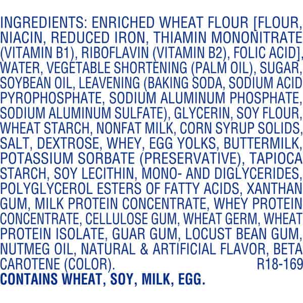 Enriched Wheat Flour [flour, Niacin, Reduced Iron, Thiamin Mononitrate (vitamin B1), Riboflavin (vitamin B2), Folic Acid], Water, Vegetable Shortening (palm Oil), Sugar, Vegetable Oil (soybean), Glycerin, Leavening (baking Soda, Sodium Acid Pyrophosphate, Sodium Aluminum Phosphate, Sodium Aluminum Sulfate), Soy Flour, Wheat Starch, Nonfat Milk, Corn Syrup Solids, Salt, Dextrose, Whey, Egg Yolks, Buttermilk, Tapioca Starch, Soy Lecithin, Mono- And Diglycerides, Polyglycerol Esters Of Fatty Acids, Xanthan Gum, Milk Protein Concentrate, Whey Protein Concentrate, Cellulose Gum, Potassium Sorbate (preservative), Wheat Germ, Wheat Protein Isolate, Guar Gum, Locust Bean Gum, Nutmeg Oil, Natural & Artificial Flavor, Beta Carotene (color).