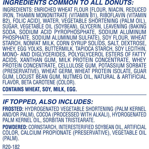 Enriched Wheat Flour [flour, Niacin, Reduced Iron, Thiamin Mononitrate (vitamin B1), Riboflavin (vitamin B2), Folic Acid], Water, Vegetable Shortening (palm Oil), Sugar, Vegetable Oil (soybean), Glycerin, Leavening (baking Soda, Sodium Acid Pyrophosphate, Sodium Aluminum Phosphate, Sodium Aluminum Sulfate), Soy Flour, Wheat Starch, Nonfat Milk, Corn Syrup Solids, Salt, Dextrose, Whey, Egg Yolks, Buttermilk, Tapioca Starch, Soy Lecithin, Mono- And Diglycerides, Polyglycerol Esters Of Fatty Acids, Xanthan Gum, Milk Protein Concentrate, Whey Protein Concentrate, Cellulose Gum, Potassium Sorbate (preservative), Wheat Germ, Wheat Protein Isolate, Guar Gum, Locust Bean Gum, Nutmeg Oil, Natural & Artificial Flavor, Beta Carotene (color). Frosted: Hydrogenated Vegetable Shortening (palm Kernel And/or Palm), Cocoa (processed With Alkali), Hydrogenated Palm Kernel Oil, Sorbitan Tristearate. Powdered: Cornstarch, Interesterified Soybean Oil, Artificial Color, Calcium Propionate (preservative), Vegetable Oil (palm).