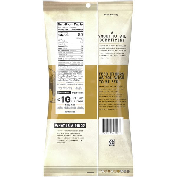 A modern take on a classic American snack, EPIC Provisions Pork Rinds are made from a blend of antibiotic-free, non-GMO, organic, and pastured pork complemented with a custom blend of BBQ spices.