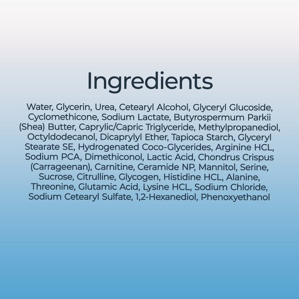 Water, Glycerin, Urea, Cetearyl Alcohol, Glyceryl Glucoside, Sodium Lactate, Butyrospermum Parkii (shea) Butter, Caprylic/capric Triglyceride, Methylpropanediol, Octyldodecanol, Dicaprylyl Ether, Tapioca Starch, Dimethicone, Glyceryl Stearate Se, Hydrogenated Coco-glycerides, Carnitine, Ceramide Np, Sodium Pca, Arginine Hcl, Serine, Arginine, Alanine, Histidine Hcl, Citrulline, Lysine Hcl, Lactic Acid, Glycogen, Mannitol, Sucrose, Pca, Glutamic Acid, Threonine, Chondrus Crispus (carrageenan), Sodium Chloride, Sodium Cetearyl Sulfate, Tocopherol, 1,2-hexanediol, Phenoxyethanol