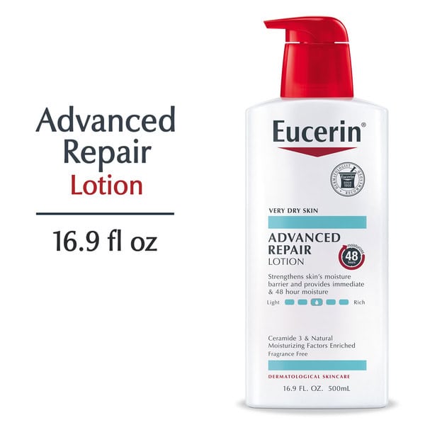 Fight dryness at its source with Eucerin Advanced Repair Body Lotion. This unscented lotion for dry skin provides 48-hour moisture for skin that looks and feels healthy. Eucerin Advanced Repair Body Lotion for dry skin is formulated with ceramides to help strengthen the skin’s moisture barrier to lock in moisture. It is also formulated with Natural Moisturizing Factors, amino acids that are naturally found in the skin, to boost moisture and help prevent dryness. This Eucerin sensitive skin lotion formula is lightweight and fast-absorbing, and smoothes, repairs and hydrates dry skin. This Eucerin body lotion for sensitive dry skin is fragrance free, dye free and paraben free. This body moisturizer can also be used as a hand lotion or foot lotion. To use, smooth this Eucerin dry skin lotion onto your skin daily. For the best results, apply Eucerin Advanced Repair Body Lotion after showering. Eucerin is a dermatologist-recommended skincare brand that is based on an uncompromising approach to science. With skin care products designed to restore and sustain healthy-looking skin, families everywhere look to Eucerin to enhance outer beauty and self-confidence.