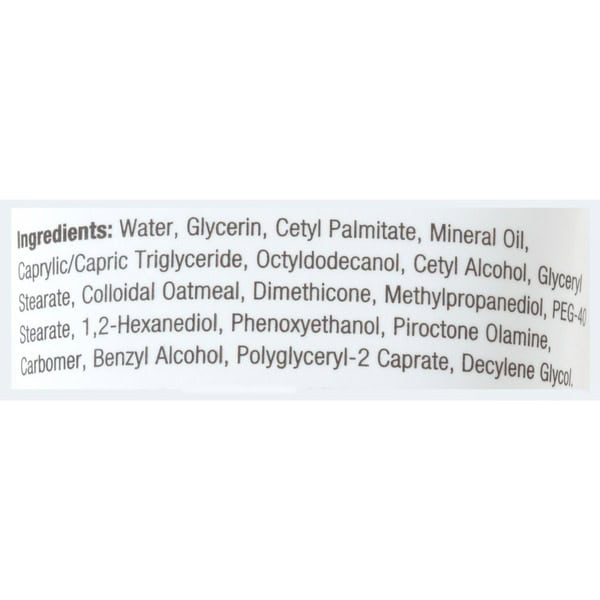 Water, Glycerin, Cetyl Palmitate, Mineral Oil, Carpylic/capric Triglyceride, Octyldodecanol, Cetyl Alcohol, Glyceryl Stearate, Colloidal Oatmeal, Dimethicone, Methylpropanediol, Peg-40 Stearate, 1,2-hexanediol, Phenoxyethanol, Piroctone Olamine, Carbomer, Benzyl Alcohol, Polyglyceryl-2 Caprate, Decylene Glycol