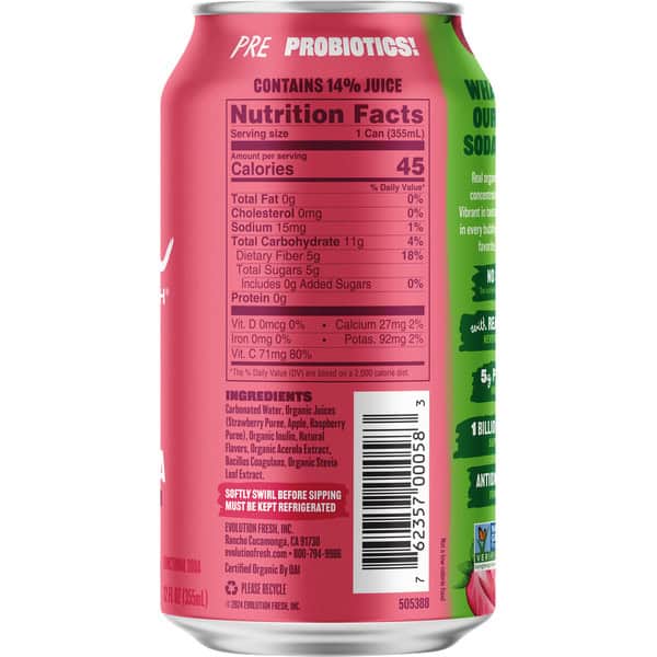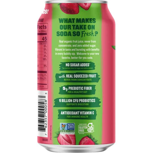 Carbonated Water, Organic Juices (strawberry Puree, Apple, Raspberry Puree), Organic Inulin, Natural Flavors, Organic Acerola Extract, Bacillus Coagulans, Organic Stevia Leaf Extract.