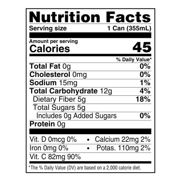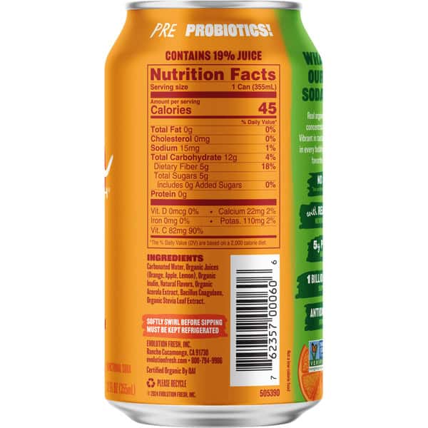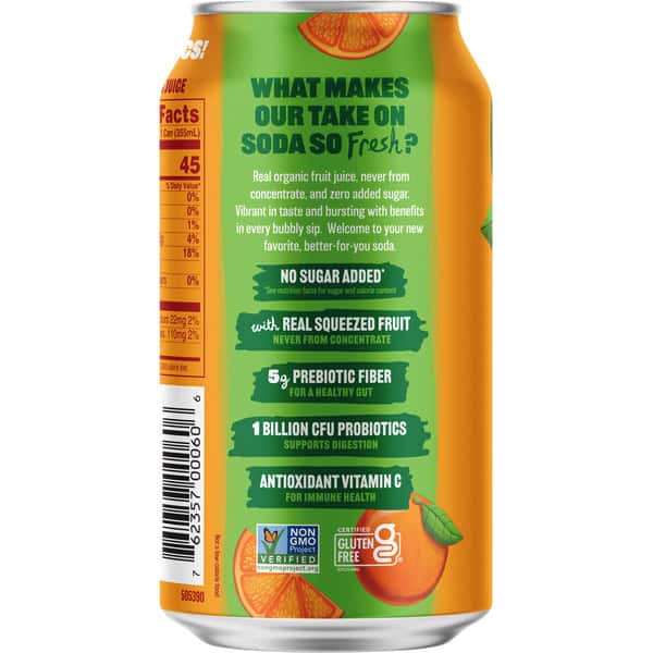 Carbonated Water, Organic Juices (Orange, Apple, Lemon), Organic Inulin, Natural Flavors, Organic Acerola Extract, Bacillus Coagulans, Organic Stevia Leaf Extract.