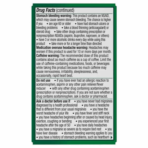 Do not use • if you have ever had an allergic reaction to acetaminophen, aspirin or any other pain reliever/fever | reducer • with any other drug containing acetaminophen |(prescription or nonprescription). If you are not sure whether a drug contains acetaminophen, ask a doctor or pharmacist. ringing in the ears or loss of hearing occurs. If pregnant or breast-feeding, ask a health professional before use. It is especially important not to use aspirin during the last 3 months of pregnancy unless definitely directed to do so by a doctor because it may cause problems in the | unborn child or complications during delivery. Stomach bleeding warning: This product contains an NSAID, which may cause severe stomach bleeding. The chance is higher if you • are age 60 or older • have had stomach ulcers or bleeding problems • take a blood thinning (anticoagulant) or steroid drug • take other drugs containing prescription or nonprescription NSAIDs (aspirin, ibuprofen, naproxen, or others) • have 3 or more alcoholic drinks every day while using this | product • take more or for a longer time than directed Medication overuse headache warning: Headaches may worsen if this product is used for 10 or more days per month. Allergy alert: Acetaminophen may cause severe skin reactions. Symptoms may include: • skin reddening • blisters • rash If a skin reaction occurs, stop use and seek medical help right away. Keep out of reach of children. In case of overdose, get medical help or contact a Poison Control Center right away. Caffeine warning: The recommended dose of this product | contains about as much caffeine as a cup of coffee. Limit the use of caffeine-containing medications, foods, or beverages while taking this product because too much caffeine may cause nervousness, irritability, sleeplessness, and, occasionally, rapid heart beat. Pain reliever. Stop use and ask a doctor if • an allergic reaction occurs. Seek medical help right away. Quick medical attention is critical for adults as well as for children even if you do not notice any signs or symptoms. Ask a doctor before use if you have never had migraines diagnosed by a health professional • you have a headache that is different from your usual migraines • you have the worst headache of your life • you have fever and stiff neck • you have headaches beginning after or caused by head injury, exertion, coughing or bending • you experienced your first headache after the age of 50 • you have daily headaches • you have a migraine so severe as to require bed rest • you have liver disease • stomach bleeding warning applies to you • you have a history of stomach problems, such as. Ask a doctor or pharmacist before use if you are • taking a prescription drug for: • diabetes • gout • arthritis. Reye’s syndrome: Children and teenagers who have or are recovering from chicken pox or flu-like symptoms should not use this product. When using this product, if changes in behavior with nausea and vomiting occur, consult a doctor because these symptoms could be an early sign of Reye’s syndrome, a rare but serious illness. Allergy alert: Aspirin may cause a severe allergic reaction which may include: • hives • facial swelling • asthma (wheezing) • shock Liver warning: This product contains acetaminophen. Severe liver damage may occur if you take • more than 2 caplets in 24 hours, which is the maximum daily amount • with other drugs containing acetaminophen • 3 or more alcoholic drinks every day while using this product. heartburn • you have high blood pressure, heart disease, liver cirrhosis, or kidney disease • you are taking a diuretic • you have asthma • you have problems or serious side effects from taking pain relievers or fever reducers • you have vomiting with your migraine headache. under a doctor’s care for any serious condition • taking any other drug • taking any other product that contains aspirin, acetaminophen, or any other pain reliever/fever reducer.