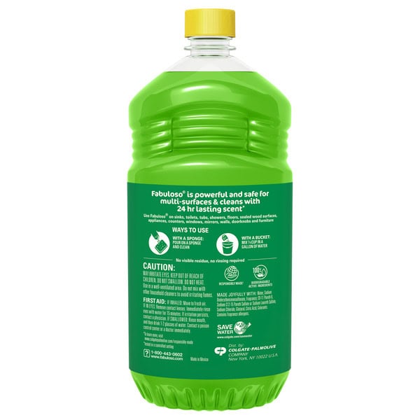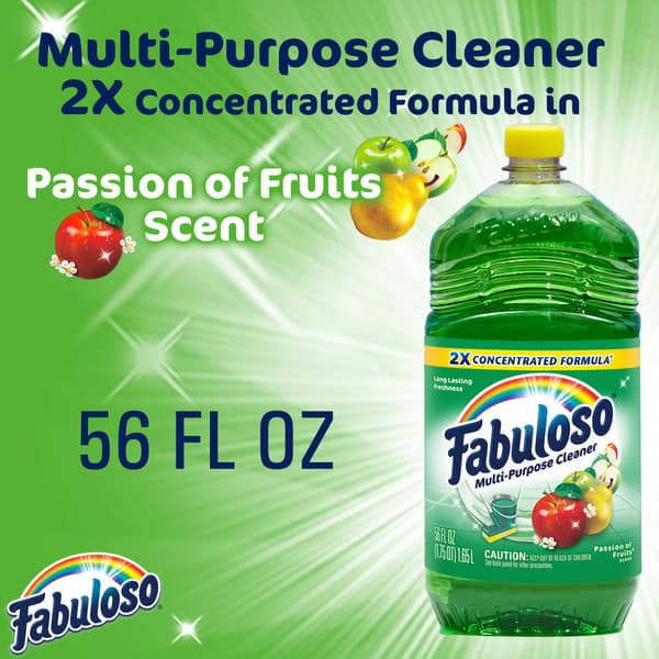 Fabuloso 2x Multi-Purpose Cleaner is the perfect solution for anyone looking for an effective way to keep their home clean and smelling great. Whether used as a bathroom cleaner, kitchen cleaner, or floor cleaner, the long-lasting passion of fruits scent will fill your home with joy. Our multi-purpose cleaner cuts through grease, grime, and dirt. Its easy-pour bottle delivers a colorful and satisfying pour every time. We understand that life isn’t always easy, but cleaning it up can be with Fabuloso multi-purpose surface cleaner. Our 2X concentrated formula provides 2x more uses and 2x more active ingredients vs our non-concentrated Fabuloso Original. It also uses 50% less plastic by following dosing instructions and getting twice as many uses out of one bottle vs. the same size of Fabuloso Original. It’s important to use Fabuloso cleaning products safely, please follow the instructions on the label. Mix 1/8 cup in a gallon of water or pour on a sponge and clean.