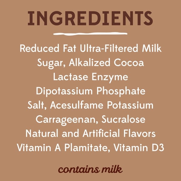 Reduced Fat Ultra-filtered Milk, Sugar, Alkalized Cocoa, Lactase Enzyme, Dipotassium Phosphate, Salt, Acesulfame Potassium, Carrageenan, Natural And Artificial Flavors, Sucralose, Vitamin A Palmitate, Vitamin D3