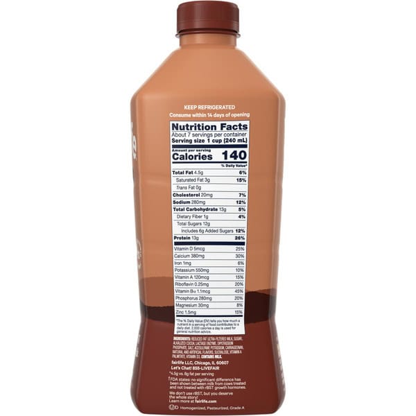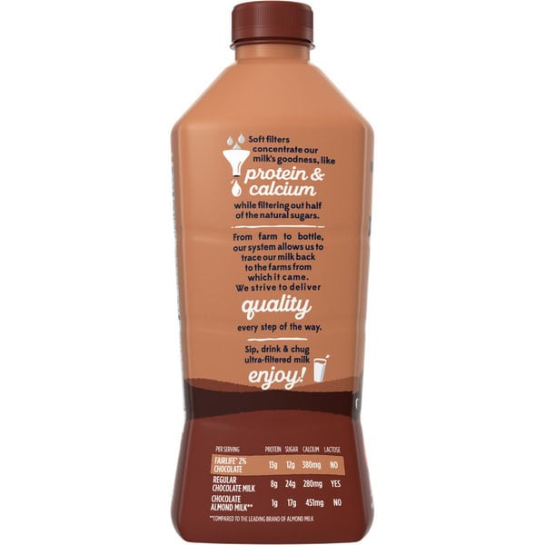 All our milk flows through soft filters to concentrate its goodness like protein and calcium while filtering out some of the natural sugars. Our rich and creamy fairlife Chocolate Ultra-Filtered Milk has 50% less sugar and 50% more protein than regular chocolate milk. Plus, there’s no artificial growth hormones used and it’s lactose free.