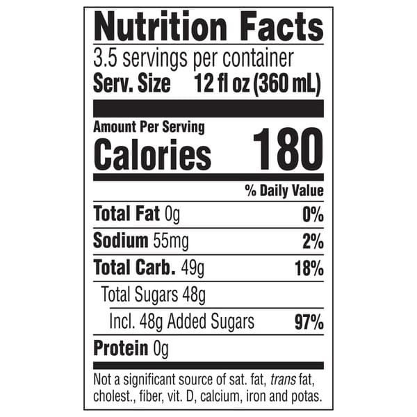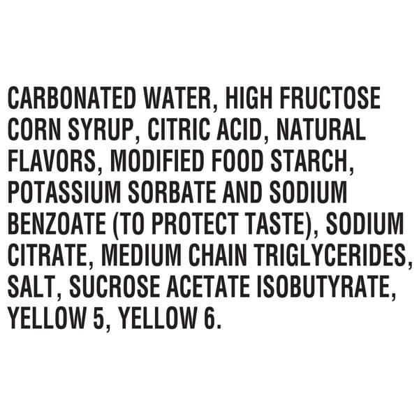 carbonated water, high fructose corn syrup, citric acid, natural flavors, modified food starch, potassium sorbate and sodium benzoate (to protect taste), sodium citrate, medium chain triglycerides, salt, sucrose acetate isobutyrate, yellow 5, yellow 6.