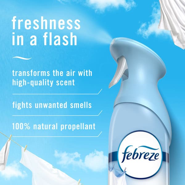 Odors. They’re everywhere… lingering in the air or arising at the most awkward times. Forget masking them with some froo-froo spray; Febreze Air Effects actually fights air odors. This can of ahhh-some straight up fights stink with a neat little molecule called cyclodextrin (Bonus: It’s naturally made from corn). It’s a handy air freshener that’s easy to use: Simply spray in a sweeping motion and fight those bad smells anywhere… the bathroom, the kitchen, that cabin you rented for the weekend, the shoe closet, your kid’s room… anytime you want an instant burst of fresh. And because Febreze AIR uses 100% natural propellants, you can confidently freshen your home every day. Looking for even more ways to breathe happy with Febreze? Take the freshness on the road with CAR Vent Clips.