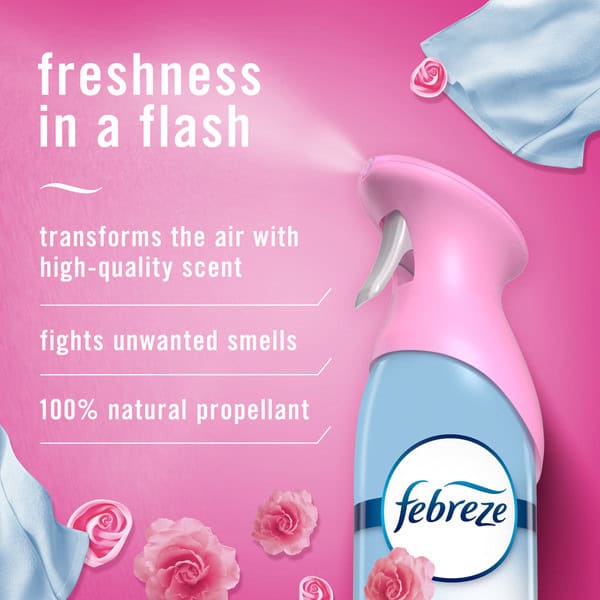 Odors. They’re everywhere… lingering in the air or arising at the most awkward times. Forget masking them with some froo-froo spray; Febreze Air Effects actually fights air odors. This can of ahhh-some straight up fights stink with a neat little molecule called cyclodextrin (Bonus: It’s naturally made from corn). It’s a handy air freshener that’s easy to use: Simply spray in a sweeping motion and fight those bad smells anywhere… the bathroom, the kitchen, that cabin you rented for the weekend, the shoe closet, your kid’s room… anytime you want an instant burst of fresh. With the fresh, just-out-of-the-dryer scent of Downy April Fresh, you can enjoy the delightful aroma without doing a single load of laundry. And because Febreze AIR uses 100% natural propellants, you can confidently freshen your home every day. Looking for even more ways to breathe happy with Febreze? Take the freshness on the road with CAR Vent Clips.