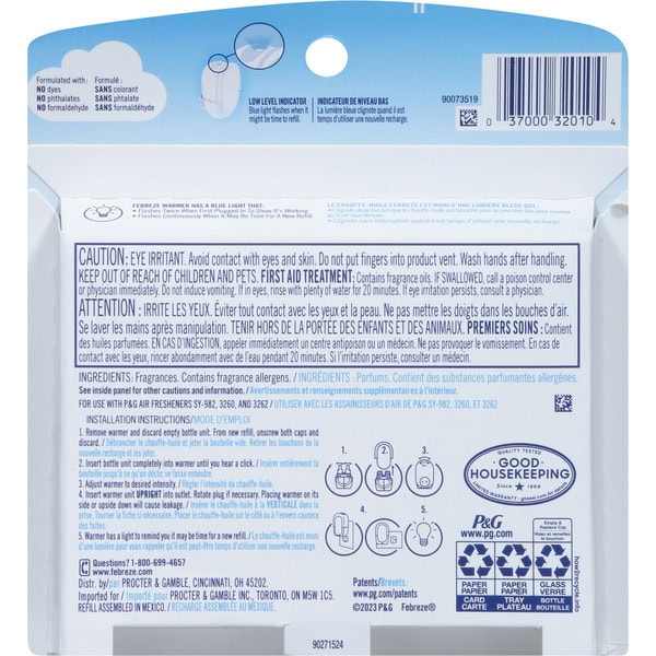 For use with P&G air fresheners SY-982, 3260, and 3262. Installation Instructions: 1. Remove warmer and discard empty bottle unit. From new refill, unscrew both caps and discard. 2. Insert bottle unit completely into warmer until you hear a click. 3. Adjust warmer to desired intensity. 4. Insert warmer unit upright into outlet. Rotate plug if necessary. Placing warmer on its side or upside down will cause leakage. 5. Warmer has a light to remind you it may be time for a new refill.