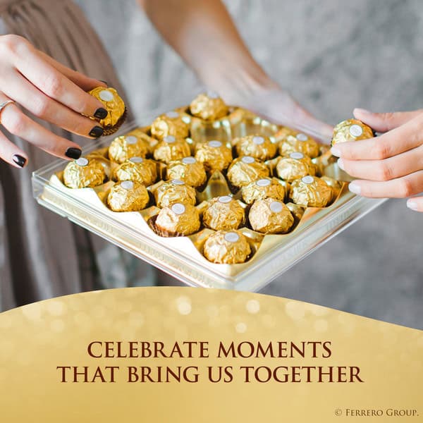 Ferrero Rocher’s milk chocolate gift box offers a unique taste experience of contrasting layers: a whole crunchy hazelnut in the heart and a delicious, creamy hazelnut filling surrounded with milk chocolate, crispy wafers and gently roasted hazelnut pieces. And thanks to its signature golden wrapper, Ferrero Rocher is even more unique and special. The iconic original. Celebrate the moment with Ferrero Rocher. Since the 1940s, Ferrero has delighted consumers with premium, one-of-a-kind chocolate treats. What began as a local pasticceria in Italy’s Piemonte region is now one of the world’s most popular confectioners, satisfying cravings in over 100 countries worldwide. Thanks to a commitment to quality, freshness and a unique taste experience, Ferrero continues to delight chocolate lovers all over the world.