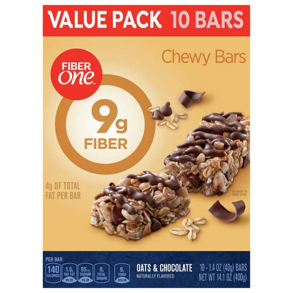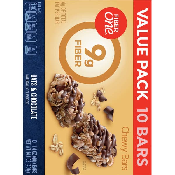 Hearty whole oats topped with a smooth chocolaty drizzle and delicious chocolate chips, Fiber One Oats & Chocolate Chewy Granola Bars provide an indulgent snack without any of the guilt. Rich chocolate chips and hearty oats help satisfy your cravings without sacrificing your healthy lifestyle. Each fiber bar contains at least 35% daily value of fiber so you’ll feel like one smart cookie when you say ‘yes’ to your sweet tooth. Diets high in fiber can help keep your digestive system on track. Choose Fiber One Chewy Barrs for your breakfast bars, office snacks or as an on-the-go treat. Contains 10 bars total.