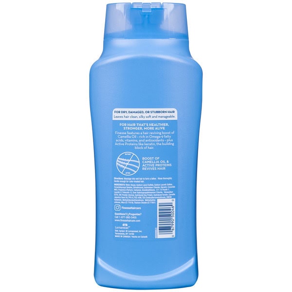 This Finesse shampoo features a hair reviving boost of camellia oil (rich in Omega-9 fatty acids, vitamins, and antioxidants) plus active proteins – soy, silk, and keratin, the building block of hair. The active proteins penetrate deep into the hair shaft for stronger, healthier hair. Finesse products help transform hair so it looks and feels more alive, while leaving it smelling fresh and clean with our delightful, signature fresh scent. Gender-neutral fragrance appeals to both women and men.