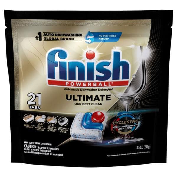Refill a tub with this pouch. Reuse. Refill. Repeat. Up to 80% plastic saved (b) by reusing your tub. 1. Open finish ultimate pouch with dry hands. 2. Empty finish tabs into finish ultimate tubs. 3. Close tub lid. 4. Discard empty refill pouch. Finish Ultimate Automatic Dishwasher Detergent Usage Instructions: Keep tabs from kids. – always re-seal pack after use 1. Handle with dry hands only 2. Additional moisture may cause tabs to stick together. Do not pull stuck tabs apart. 3. Do not unwrap, break, or puncture. Dissolves completely in wash. 4. Place one tab per wash in dry dispenser. 5. Do not place in cutlery basket. 6. For best results use eco/auto cycles. Make sure all items are dishwasher safe & follow the manufacturer’s instructions. Not recommended for use with true silver cutlery. To protect quality and prevent sticking of tabs, always reseal pack after use and store away from heat and moisture. For best results in hard water, use Finish Jet-Dry Rinse Aid. Finish Ultimate is safe for septic systems. (b) Plastic saved by refilling this pouch Into 28ct, 38ct, 52ct or 62ct tub.