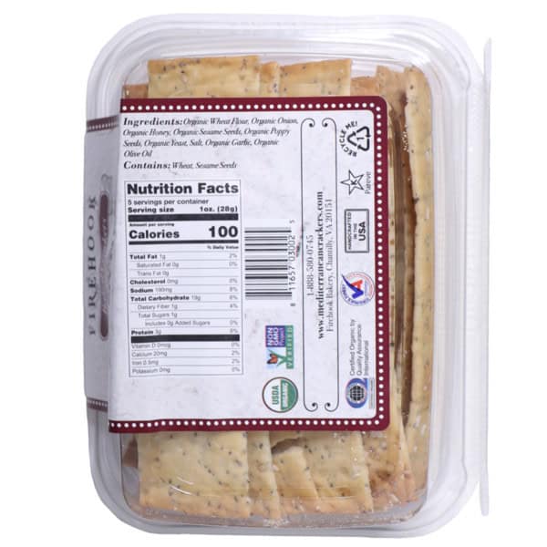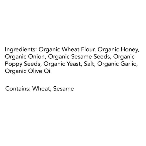 Organic Wheat Flour, Organic Honey, Organic Onion, Organic Sesame Seeds, Organic Poppy Seeds, Organic Yeast, Salt, Organic Olive Oil