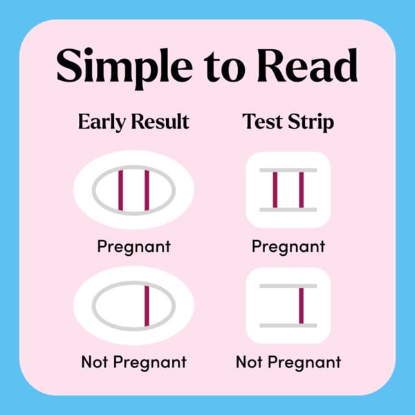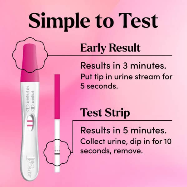 Easy Guide: Please read detailed instructions inside before testing (in English and Spanish). Test Early with early result tests. 1. Test as early as 6 days before the day of your missed period. 2. Test: Put the tip of the test in the urine stream for 5 seconds. 3. Read your results after 3 minutes. Pregnant. Not pregnant. Two pink lines is a pregnant result (even if either line is faint). Read insert for more information about result. Test often with pregnancy test strips. 1. Test on the day of your missed period and any day thereafter. 2. Collect urine in a disposable cup. 3. Dip the test strip into the urine sample with arrows pointing down for 10 seconds. 4. Remove the test strip from the urine sample and place on a non-absorbent flat surface. Wait 5 minutes. 5. Easy-to-read strip. Pregnant. Not pregnant. Two pink lines is a pregnant result (even if either line is faint). Read insert for more information about result.