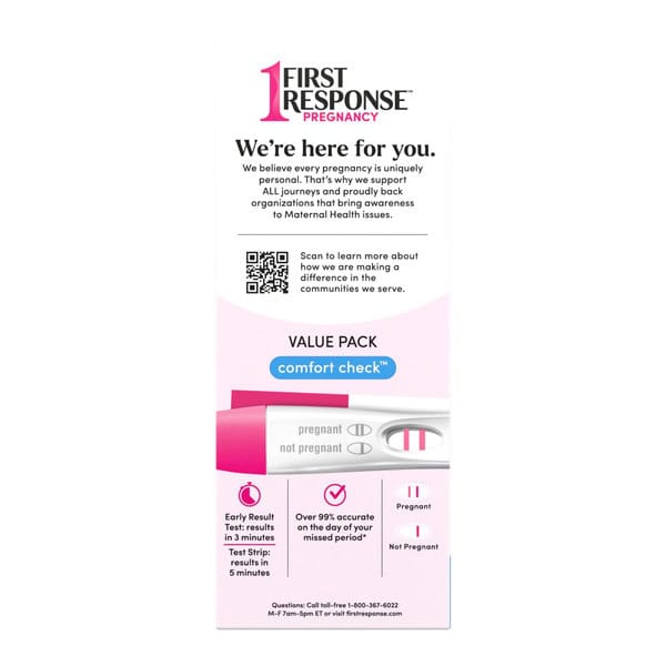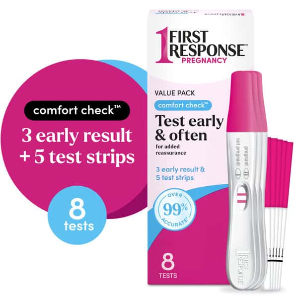 When testing for pregnancy you want to be sure of your result. Test EARLY & OFTEN with First Response Comfort Check Pregnancy Test, 8 Count. FIRST RESPONSE Comfort Check includes 8 pregnancy tests to help you test confidently and conveniently with 3 First Response Early Result Pregnancy Tests and 5 FIRST RESPONSE Pregnancy Test Strips.