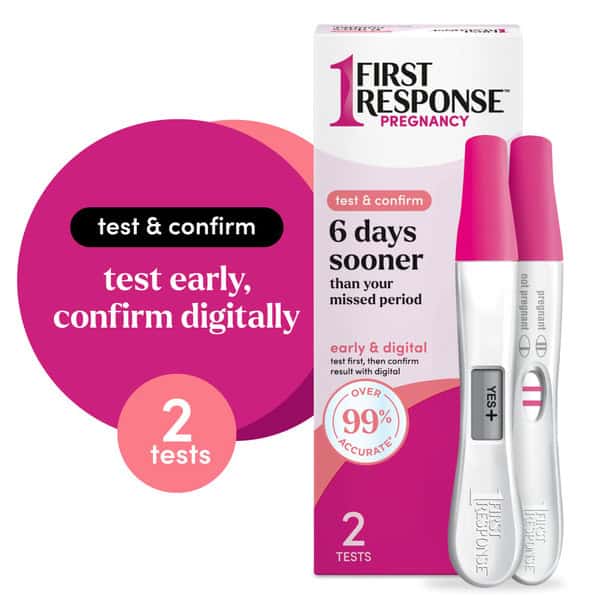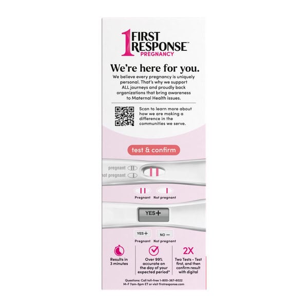 Test & Confirm your pregnancy test results 6 Days Sooner* with FIRST RESPONSE Test & Confirm Pregnancy Test, 1 Line Test and 1 Digital Test Pack! Sensitive enough to capture scant amounts of the pregnancy hormone, FIRST RESPONSE Early Result and First Response Digital pregnancy tests give you results 6 days sooner than your missed period. [1] FIRST RESPONSE Early Result Pregnancy Test is over 99% accurate from the day of your expected period [2]. Result appears in 3 minutes. FIRST RESPONSE Digital Pregnancy Test is over 99% accurate from the day of the expected period [2]. With First-to-Detect technology, it has an easy-to-read YES+ / NO-” result and a unique “test is working” indicator that lets you know the test is ready for use. Result in just 3 minutes. [1] FIRST RESPONSE detects the pregnancy hormone 6 days sooner than the day of your missed period (5 days before the day of expected period). [2] >99% accurate at detecting typical pregnancy hormone levels from the day of your expected period. Note that hormone levels vary.