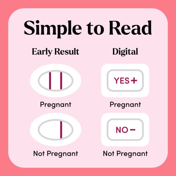 Easy Guide: Please read detailed instructions inside before testing (in English and Spanish). 1. Use early result test. 2. Test as early as 6 days before the day of your missed period. 3. Put the tip of the test in the urine stream for 5 seconds. 4. Wait 3 minutes. 5. Read results. Pregnant: Two pink lines is a pregnant result (even if either line is faint). Not pregnant. Ready to retest? With digital pregnancy test: 6. Use digital test. 7. Confirm. Steady clock means test is ready. Blinking clock means test is working. Yes+ pregnant. No- Not pregnant. Result confirmed. Read insert for more information about result. Use as directed. For in vitro diagnostic use. Not to be taken internally. Single use device.