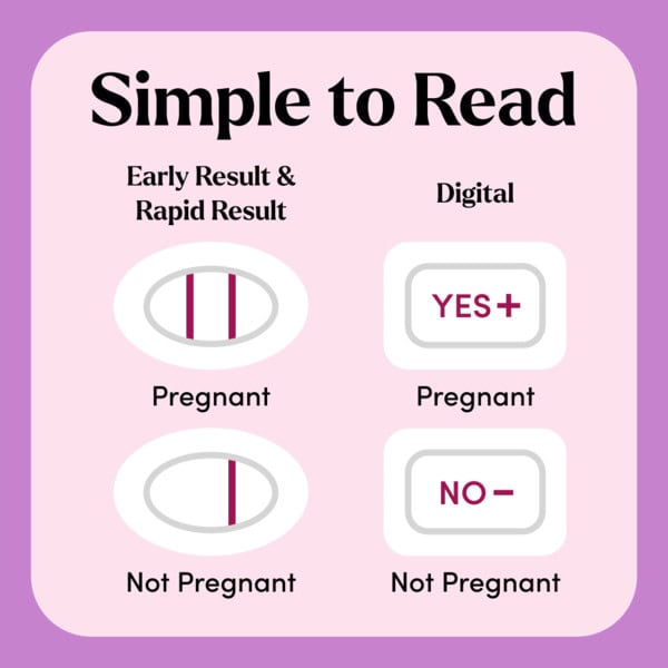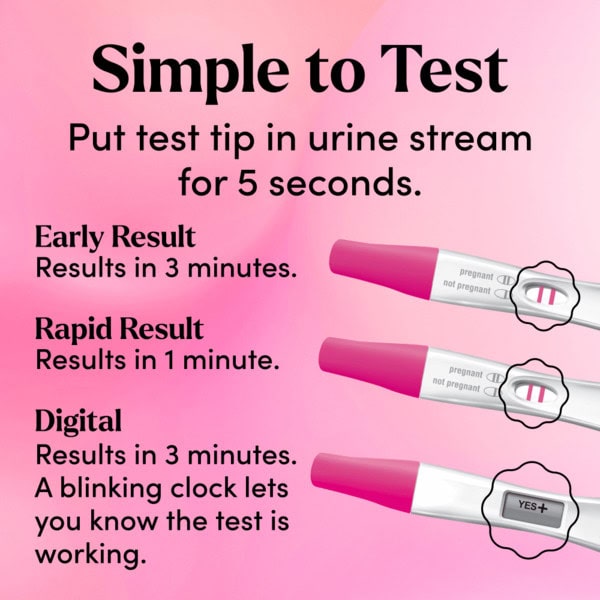 Easy Guide: Please read detailed instructions inside before testing (in English and Spanish). Check with Early Result test (pink foil): 1. Test as early as 6 days before the day of your missed period (5 days before day of expected period). 2. Read your result after 3 minutes. Pregnant. Not pregnant. Read insert for more information about result. Double Check with Digital test (white foil): 1. Test again before the day of your missed period (up to 5 days before day of expected period). 2. Read your result after 3 minutes. Steady clock means test is ready. Blinking clock means test is working. Pregnant. Not pregnant. Read insert for more information about result. Triple Check with Rapid Result test (teal foil): 1. Test on the day of your missed period. 2. Read your results after 60 seconds. Pregnant. Not pregnant. Read insert for more information about result.
