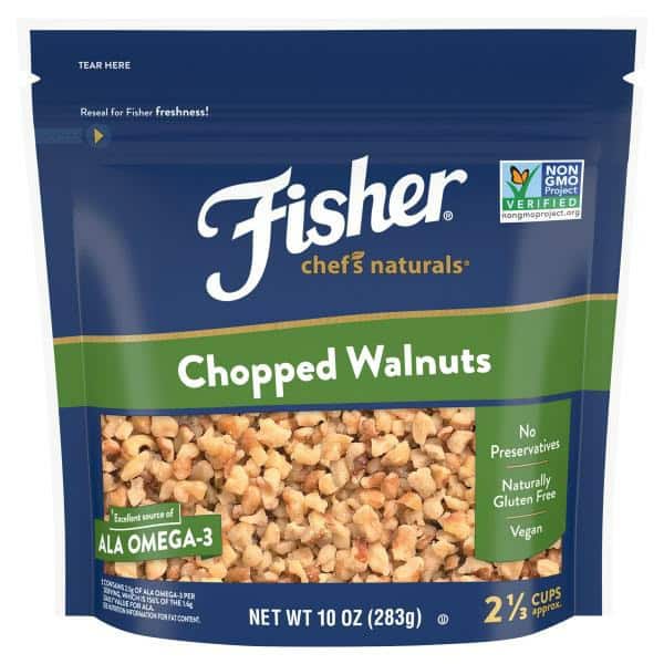 Contains 10 ounces of chopped walnuts. 10 ounces = 2 ⅓ cups Fisher walnuts add an earthy, fruity, and mildly tart flavor and tender texture to breakfasts and desserts, appetizers and salads, and meats and dips No Preservatives, naturally gluten free, Non-GMO Project verified, American Heart Association certified*, vegan, and an Excellent source of ALA Omega-3 Grown in Northern California Fisher’s Freshness Seal locks in flavor and re-seals the signature stand-up bag to keep nuts fresh even after opening