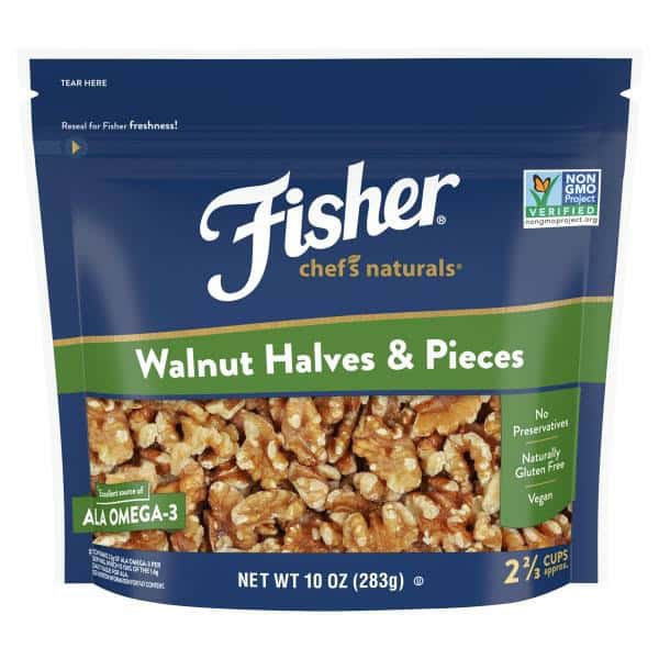 Naturally Gluten Free. Vegan. American Heart Association Certified: Meets criteria for heart-healthy food. Scientific evidence suggests, but does not prove, that eating 1.5 ounces per day of most nuts, such as walnuts, as part of a diet low in saturated fat and cholesterol may reduce the risk of heart disease. See nutrition information for fat content. Heart-check mark does not apply to recipes. No preservatives. Excellent source of ALA Omega-3 (Contains 2.5 g of ALA Omega-3 per serving, which is 156% of the 1.6 g daily value for ALA. Excellent source of ALA Omega-3). See nutrition information for a fat content. Non-GMO Project verified. nongmoproject.org. 2-2/3 cups approx. Fisher really goes nuts for fresh idea in the kitchen, and we know you do too! Enjoy sharing this delicious recipe with family and friends. California Walnuts. fishernuts.com. Questions? Comments? Email us at info(at)fishernuts.com. Reseal for Fisher freshness! Packed in U.S.A. Fisher® really goes nuts for fresh ideas in the kitchen, and we know you do too! Enjoy sharing this delicious recipe with family and friends.
