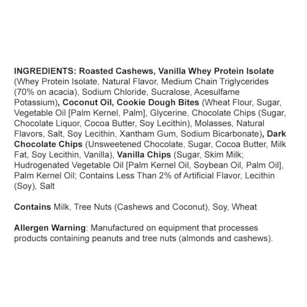 Dry Roasted Cashews, Vanilla Ice Cream Whey Protein Isolate, Coconut Oil, Cookie Dough Bits, Ghirardelli Dark Chocolate Chips, Hershey’s Vanilla Chips