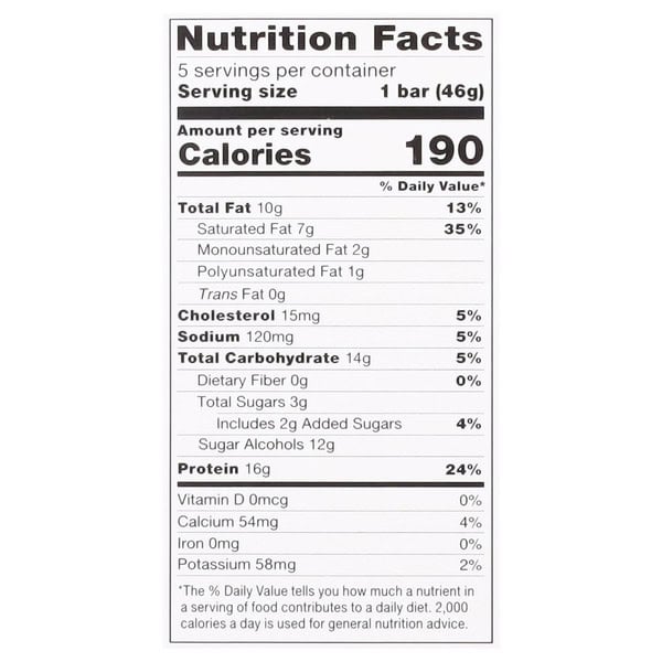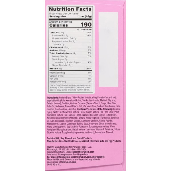 Rotein Blend (whey Protein Isolate, Whey Protein Concentrate), Vegetable Oils (palm Kernel And Palm), Soy Protein Isolate, Maltitol, Glycerin, Gelatin [bovine], Sorbitol, Graham Crumble (tapioca Starch, Sugar, Rice Flour, Palm Oil, Molasses, Natural Flavor, Salt, Caramel Color, Sodium Bicarbonate, Soy Lecithin, Xanthan Gum, Annatto). Contains 2% Or Less Of The Following: Glucose Syrup, Water, Sunflower Oil, Natural Flavor, Sugar, Natural Red Food Color (palm Kernel Oil, Natural Red Pigment [beet], Natural Rice Bran Extract [emulsifier]. Natural Orange Pigment [annatto], Natural Yellow Pigment [turmeric]), Soybean Oil, Salt, Sucralose, Titanium Dioxide, Sunflower Lecithin, Vanilla Powder, Maltodextrin, Sodium Caseinate, Baking Soda, Propylene Glycol Mono Esters, Mono & Diglycerides, Soy Lecithin, Potassium Sorbate (preservative), Whey, Acetylated Monoglycerides, Beta Carotene (for Color), Vitamin A Palmitate, Silicon Dioxide, Natural Tocopherols (to Preserve Freshness), Peanut And Almond.