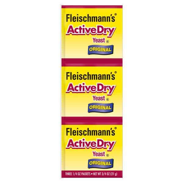 1 packet (1/4 oz) = approx 2-1/4 teaspoons. Gluten free. About Fleischmann’s ActiveDry Yeast: the original dry yeast; highly stable and valued for its reliable performance; not recommended for recipes that call for instant or RapidRise yeast. Scan this code or visit www.breadworld.com/yeast101 for tips & how to’s on water temperature, kneading, rising and more. www.breadworld.com. Baking Helpline: 1-800-777-4959. Product of Canada.