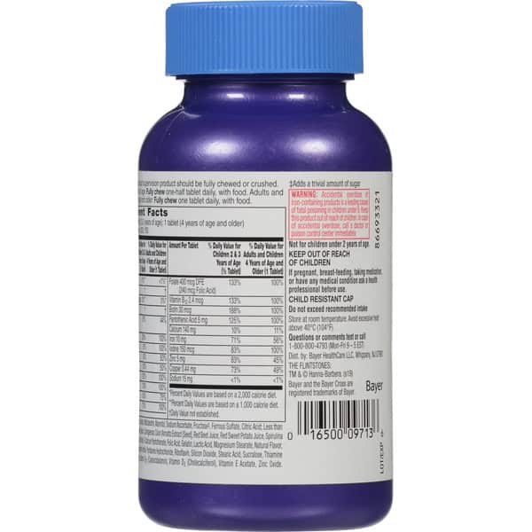 Granulated Calcium Carbonate (calcium Carbonate, Dextrose Monohydrate, Sugar, Maltodextrin, Microcrystalline Cellulose), Sorbitol, Sodium Ascorbate, Ferrous Fumarate, Natural And Artificial Flavoring, Pregelatinized Starch, Dl-alpha Tocopheryl Acetate; Less Than 2% Of: Beta-carotene, Biotin, Calcium Pantothenate, Cholecalciferol, Cupric Oxide, Cyanocobalamin, Fd&c Blue #2 Lake, Fd&c Red #40 Lake, Fd&c Yellow #6 Lake, Folic Acid, Gelatin, Magnesium Oxide, Magnesium Stearate, Mono- And Diglycerides, Niacinamide, Potassium Iodide, Pyridoxine Hydrochloride, Phytonadione, Riboflavin, Silicon Dioxide, Soy Lecithin, Sucralose, Thiamine Mononitrate, Vitamin A Acetate, Zinc Oxide.
