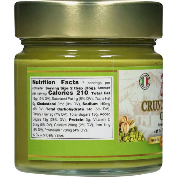 Sugar, Vegetable Oils (refined Palm, Sunflower), Pistachio Paste, Skimmed Milk Powder, Granular Caramelized Pistachio (pistachio, Sugar), Maltodextrin, Cocoa Butter, Emulsifier: Soy Lecithin, Flavorings, Colors: Caramel, Chlorophyllins, Salt.