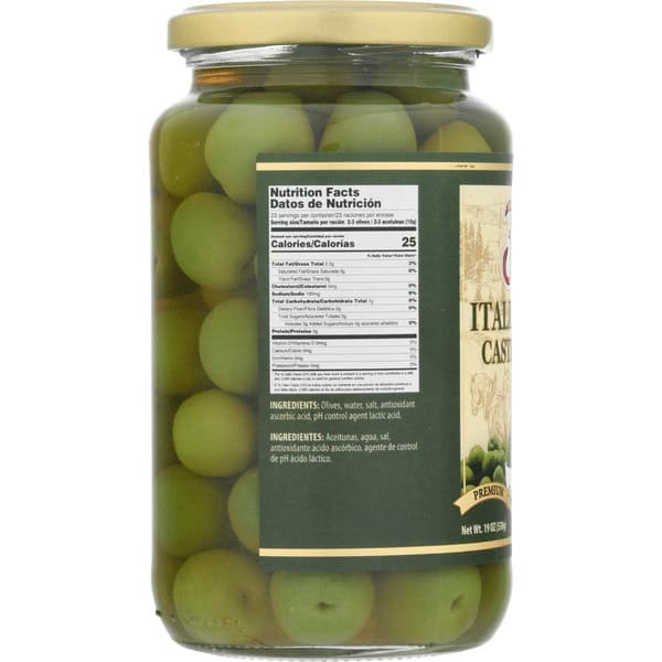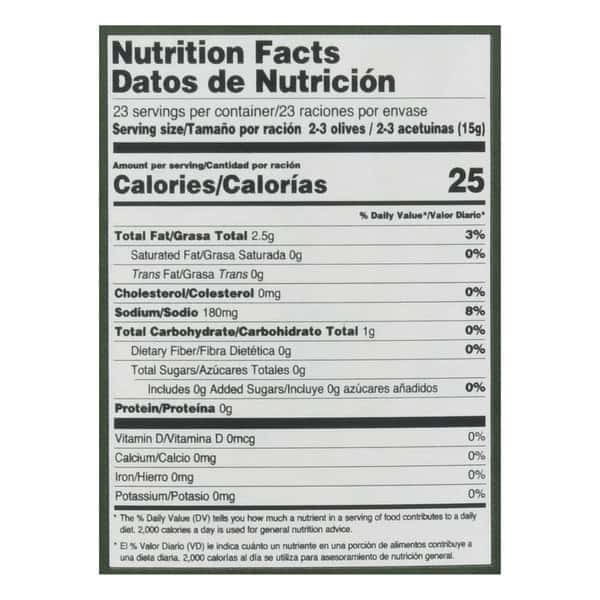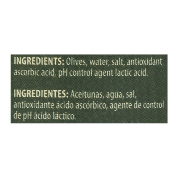 Olives, Water, Salt, Antioxidant Ascorbic Acid, pH Control Agent Lactic Acid.