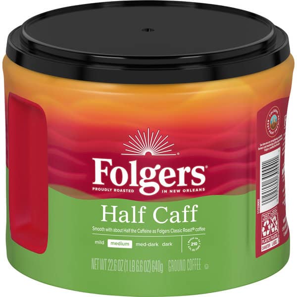 Folgers Half Caff ground coffee packs irresistible taste in every cup, with less caffeine — it has about half the caffeine of Folgers Classic Roast coffee. From the very first sip of this full-bodied medium roast coffee, you’re greeted by smooth, balanced flavor that makes for some seriously easy drinking. But it’s not just quality coffee you’re tasting — it’s the exceptional craft and passion behind every batch, proudly roasted in New Orleans by our talented team. So, go ahead and brew it up. Our ground coffee is ready to prep with any method you throw at it, from French press to automatic drip. Enjoy it for yourself.