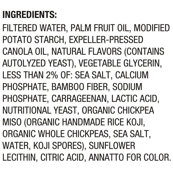 Filtered Water, Palm Fruit Oil, Modified Potato Starch, Expeller-pressed Canola Oil, Natural Flavors (contains Autolyzed Yeast), Vegetable Glycerin, Less Than 2% Of: Sea Salt, Calcium Phosphate, Bamboo Fiber, Sodium Phosphate, Carrageenan, Lactic Acid, Nutritional Yeast, Organic Chickpea Miso (organic Handmade Rice Koji, Organic Whole Chickpeas, Sea Salt, Water, Koji Spores), Sunflower Lecithin, Citric Acid, Annatto For Color