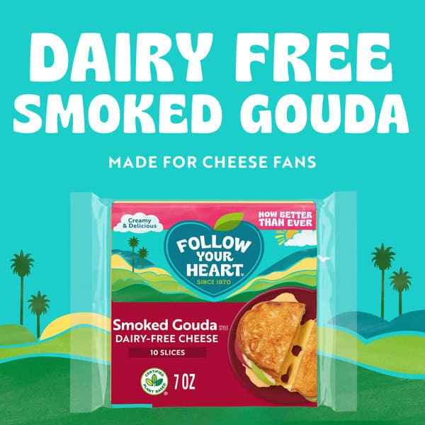 • VEGAN CHEESE SLICES: One 10 ct pack of new and improved Follow Your Heart Smoked Gouda Style Soy Free, Gluten Free and Dairy Free Cheese Slices – delicious in recipes for breakfast, appetizers and dinner