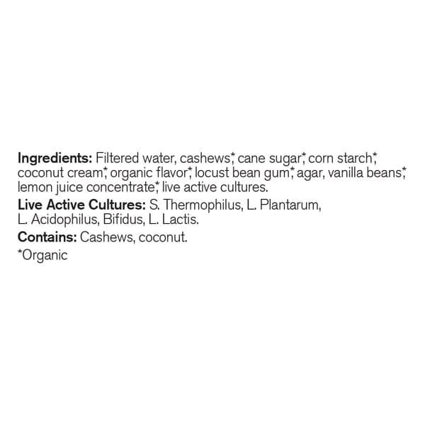 Cashewmilk (filtered Water, Cashews*), Cane Sugar*, Tapioca Starch*, Pectin, Locust Bean Gum*, Natural Flavor*, Vanilla Beans*, Lemon Juice Concentrate*, Coconut Cream*, Live Active Cultures.