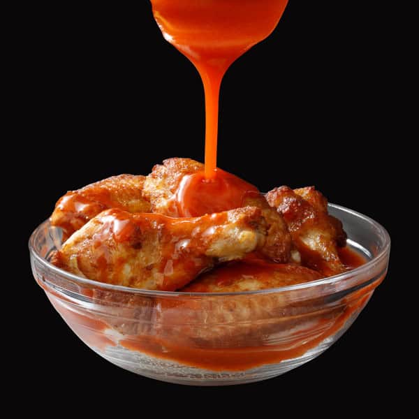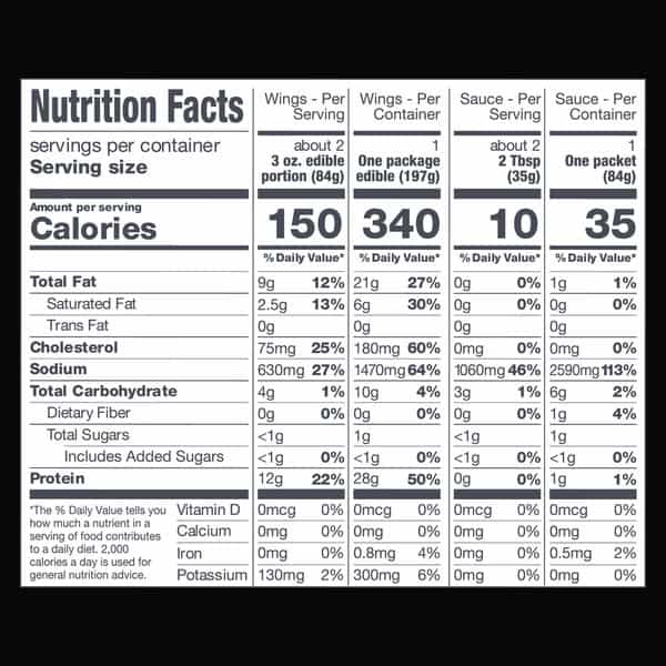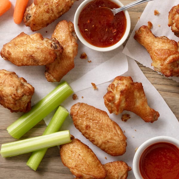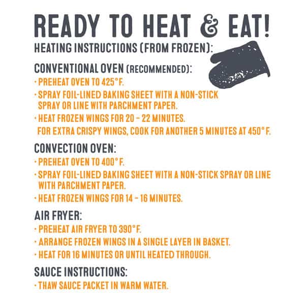 Ready to heat & eat. Heating Instructions (From Frozen): Conventional Oven (Recommended): Preheat oven to 425 degrees F. Spray foil-lined baking sheet with a non-stick spray or line with parchment paper. Heat frozen wings for 20 – 22 minutes. For extra crispy wings, cook for another 5 minutes at 450 degrees F. Convection Oven: Preheat oven to 400 degrees F. Spray foil-lined baking sheet with a non-stick spray or line with parchment paper. Heat frozen wings for 14 – 16 minutes. Air Fryer: Preheat air fryer to 390 degrees F. Arrange frozen wings in a single layer in basket. Heat for 16 minutes or until heated through. Sauce Instructions: Thaw sauce packet in warm water.