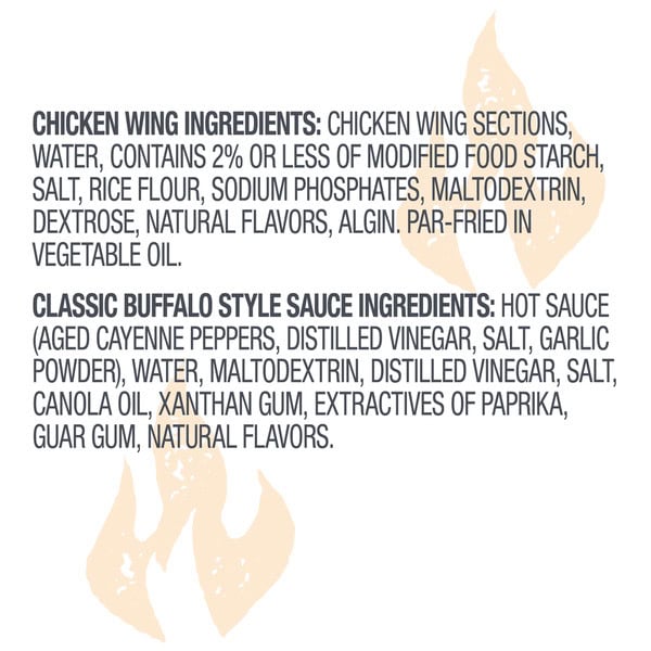 Chicken Wing – Chicken Wing Sections, Water, Contains 2% Or Less Of Modified Food Starch, Salt, Rice Flour, Sodium Phosphates, Maltodextrin, Dextrose, Natural Flavors, Algin, Par-fried In Vegetable Oil,classic Buffalo Style Sauce – Hot Sauce (aged Cayenne Peppers, Distilled Vinegar, Salt, Garlic Powder), Water, Maltodextrin, Distilled Vinegar, Salt, Canola Oil, Xanthan Gum, Extractives Of Paprika, Guar Gum, Natural Flavors