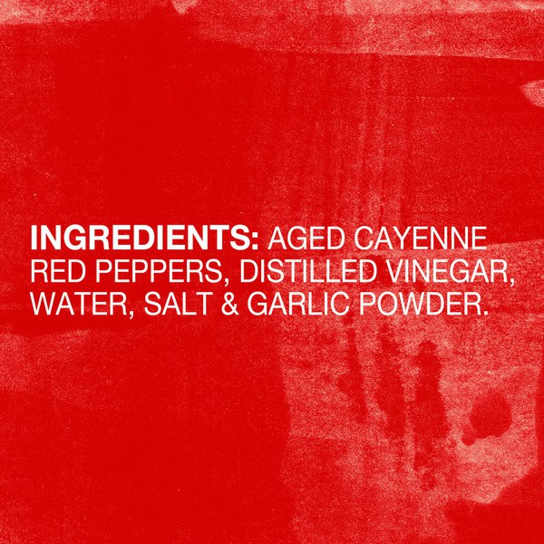 Aged Cayenne Red Peppers, Distilled Vinegar, Water, Salt, Garlic Powder